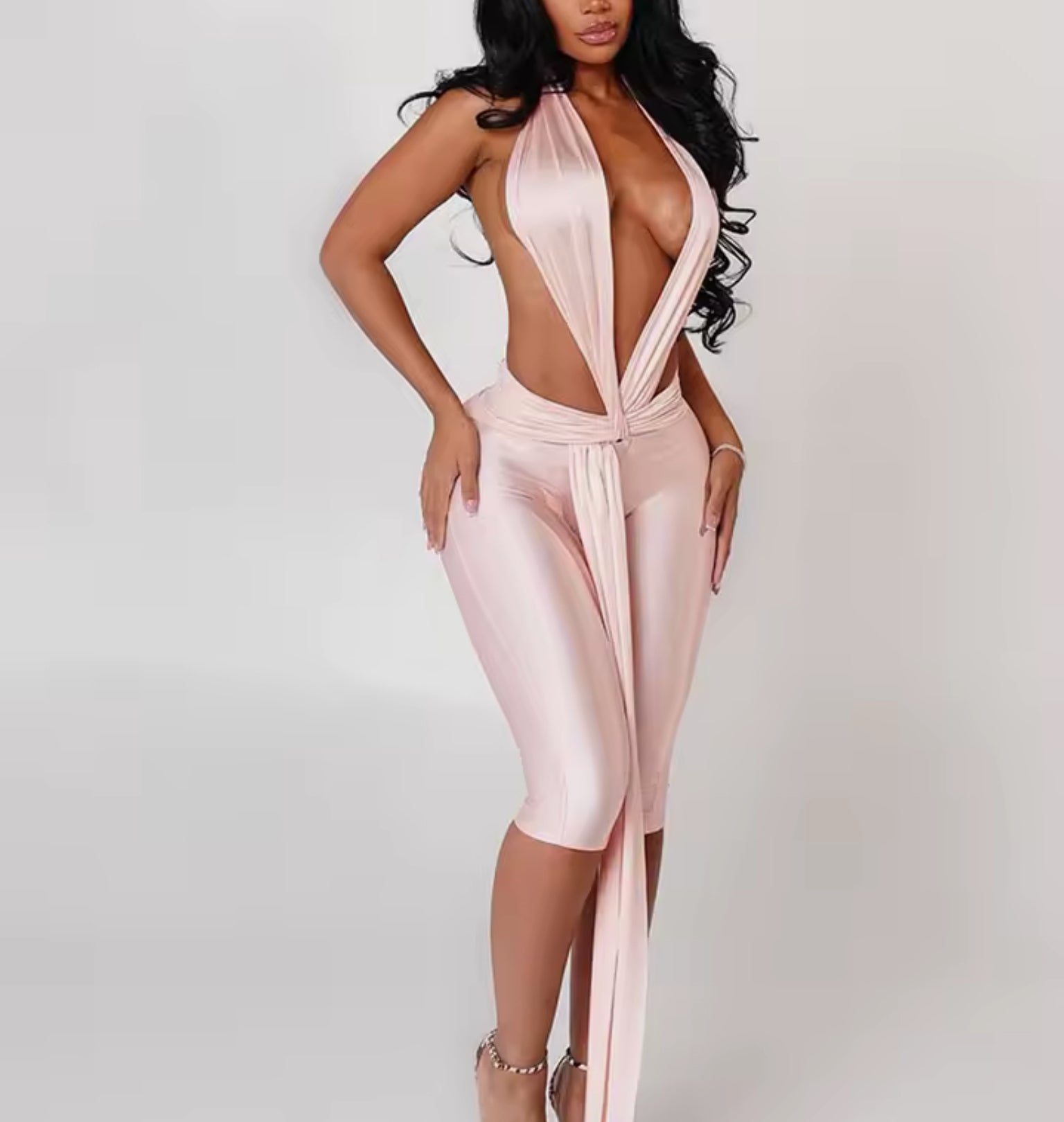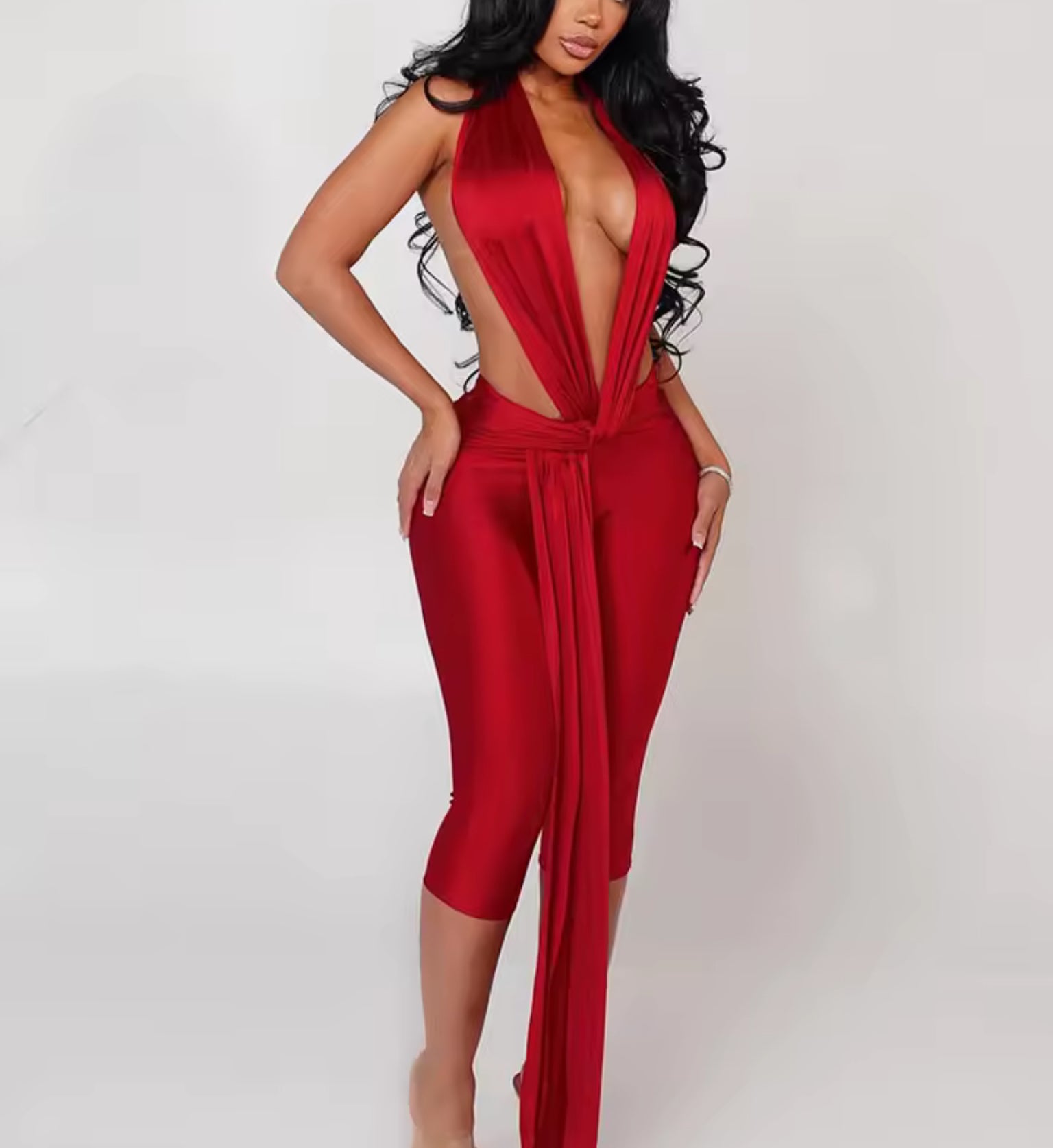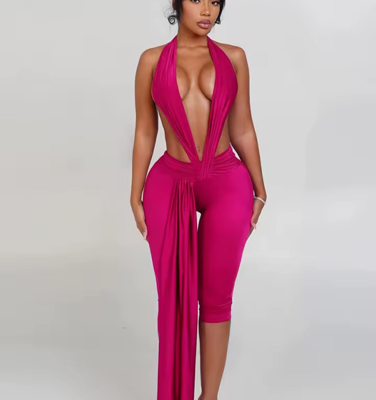 Osez l'élégance audacieuse avec cette combinaison spectaculaire à décolleté plongeant. Son design sophistiqué avec drapé frontal et dos nu crée une silhouette irrésistible, parfaite pour faire sensation lors de vos soirées glamour.